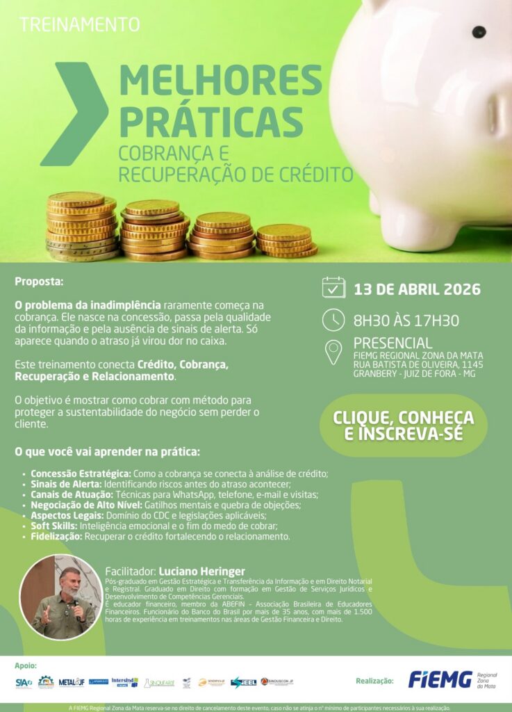 A FIEMG Regional Zona da Mata realiza, no dia 13 de abril, o treinamento “Melhores Práticas de Cobrança e Recuperação de Crédito”, uma capacitação voltada a empresários, gestores e profissionais que desejam aprimorar a gestão financeira e reduzir impactos da inadimplência nas empresas.