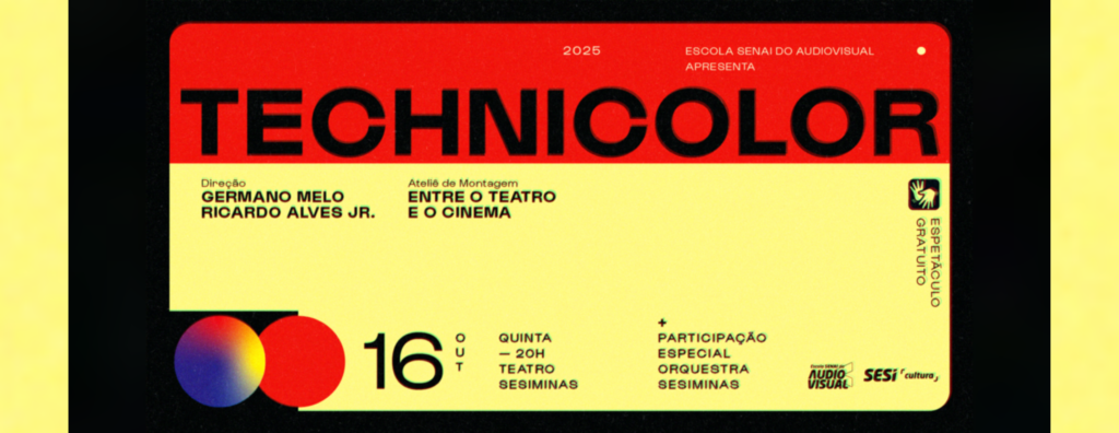 Onde termina o palco e começa a tela? No próximo dia 16 de outubro, a Escola SENAI do Audiovisual leva ao Teatro SESIMINAS o espetáculo Technicolor, resultado prático do curso Ateliê de Montagem: Entre o Teatro e o Cinema. A montagem propõe uma experiência sensorial e metalinguística que une teatro e cinema em cena, e surge como culminância de um processo formativo que convida os participantes a viver todas as etapas da criação artística.