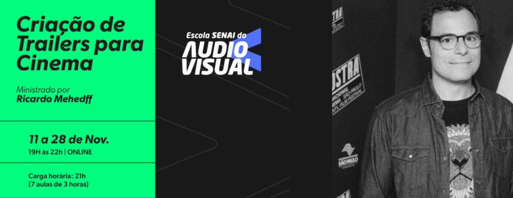 Estão abertas as inscrições para o Curso de Trailer para Cinema, realizado pela Escola SENAI do Audiovisual. O curso será oferecido online, nos dias 11, 13, 17, 19, 25, 27 e 28 de novembro, com 21 horas de aula ao vivo. A proposta é formar profissionais aptos a criar trailers para cinema e televisão, passando por todas as etapas do processo criativo, da análise do filme à finalização do corte.