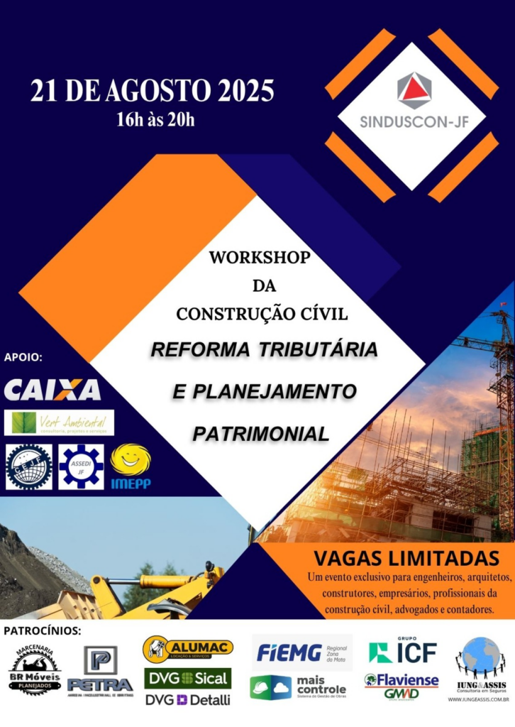 Em celebração aos seus 79 anos de atuação em prol do setor que representa, o Sindicato da Indústria da Construção Civil de Juiz de Fora (Sinduscon-JF) realizará, no dia 21 de agosto, o Workshop “Reforma Tributária e Planejamento Patrimonial para o Setor da Construção Civil”, na sede da FIEMG Regional Zona da Mata, em Juiz de Fora. O evento será um marco na agenda do setor, reunindo empresários, engenheiros, advogados, contadores e profissionais da cadeia produtiva para discutir as principais transformações e estratégias que impactam diretamente as empresas da região.
